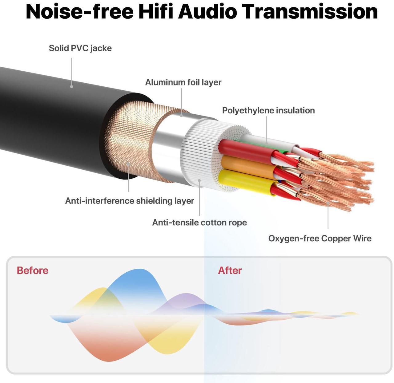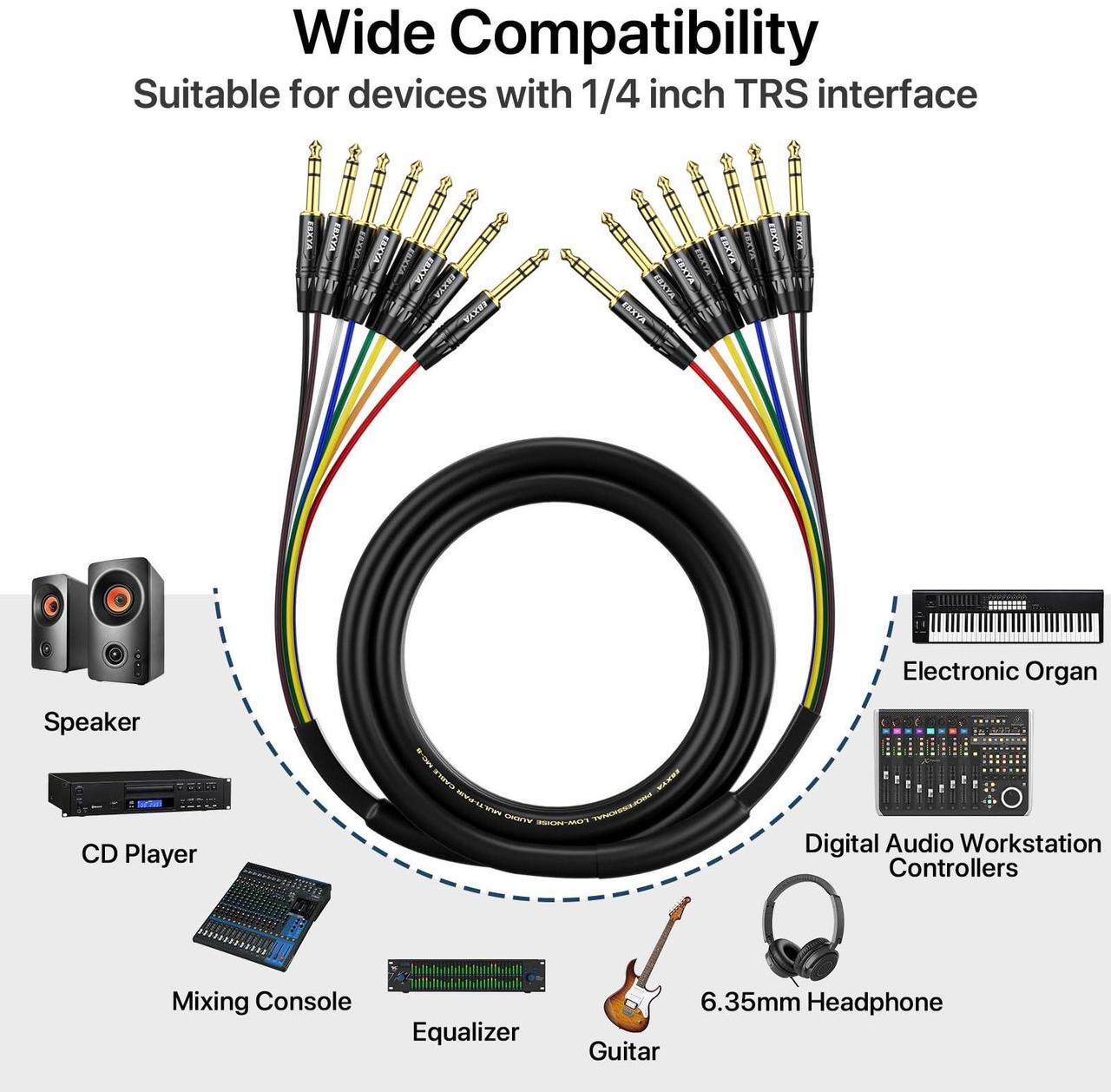 - Anti-interference design: The 8-channel TRS to TRS cable adopts 24AWG oxygen-free copper conductors and multiple shielding designs, effectively reducing signal interference. The TRS connector adopts gold plating technology to minimize further electromagnetic interference (EMI) and radio frequency interference (RFI), ensuring the transmission of high-fidelity audio signals