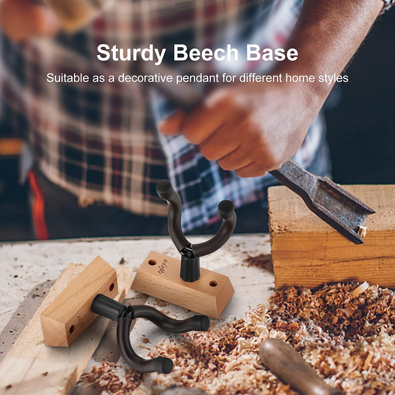 Superior Quality Guitar Wall Mount This natural wooden guitar wall hanger has a smooth, painted exterior that is free of burrs and blemishes. The exterior of guitar hooks is composed of soft, thick silicone, and the interior is constructed of strong iron, so they won't melt or harm the neck for a very long time. The wall-mounted guitar holder is extremely durable thanks to the anchors and screws that come with it.