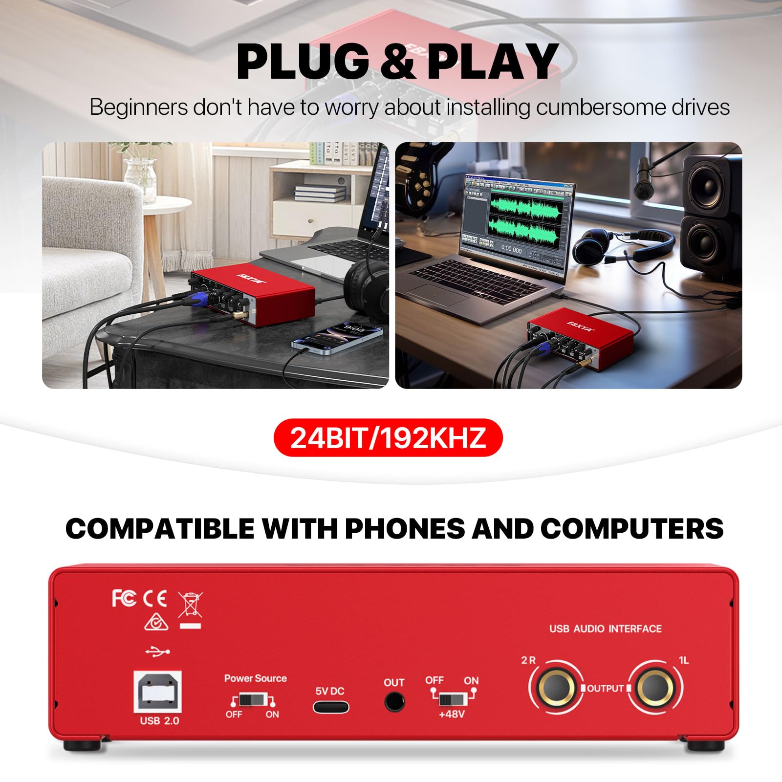 - [User Friendly for Beginners] - Designed with novice users in mind, the interfaz de audio mixer for Studio is plug and play. Forget about complicated installations and driver hassles, just ready to work as soon as you connect the interface with your guitar, DAW or PC. You don't need to be a tech expert to start creating amazing audio. (After connecting to the power supply, please turn the "Power Source" key to "ON").